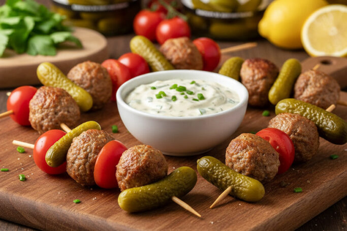 Esta receta eleva un clásico como las albóndigas, convirtiéndolas en una tapa sofisticada y fresca, donde los pepinillos juegan un papel crucial tanto en el sabor como en la textura.