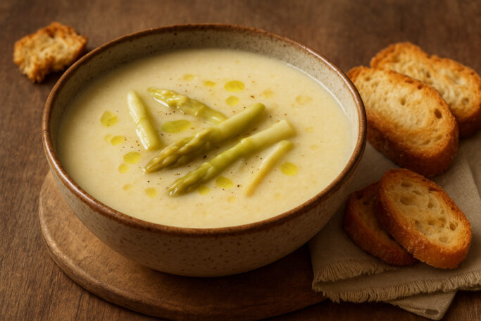 Los tallos de espárragos blancos en conserva, a menudo relegados a guarnición, se convierten aquí en el alma de una crema aterciopelada, delicada y llena de sabor vegetal. Ideal como primer plato o cena ligera.