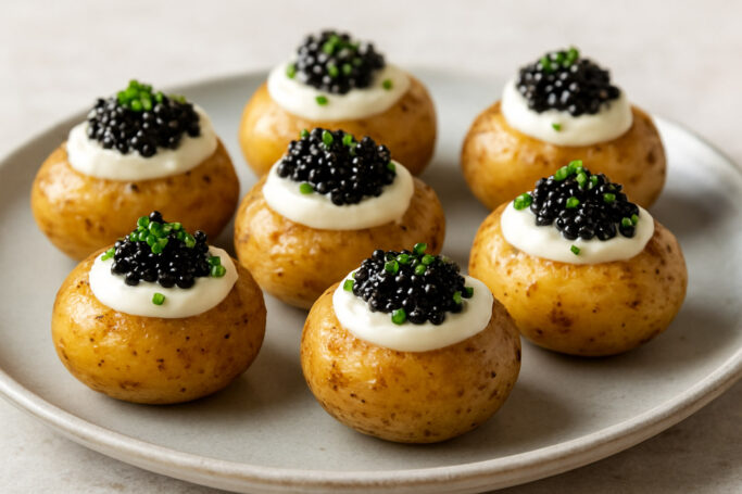 Un aperitivo cálido, elegante y muy fácil de preparar. La combinación de la patata tierna con la crema fresca y el toque salino del caviar crea un contraste espectacular.