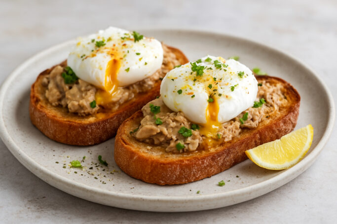 Servir inmediatamente para disfrutar del contraste entre el pan caliente, el huevo cremoso y el hígado delicado.